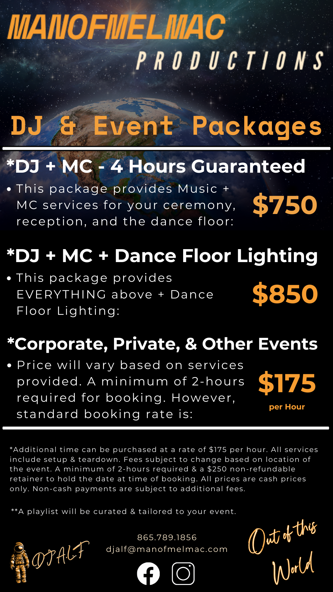 Explore our services and choose what best fits your budget. Still got questions, contact us and we will connect with you and make sure we get you taken care of, after all, we want to make your event….. “Out of this World!”